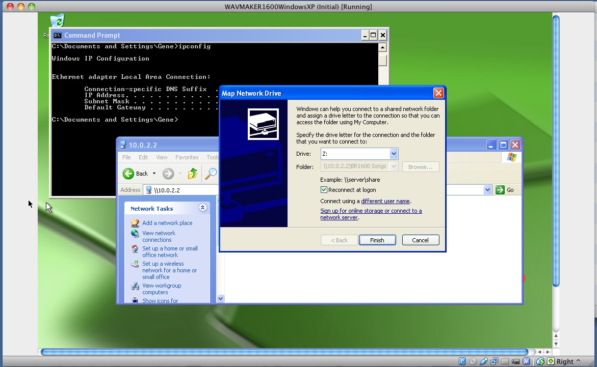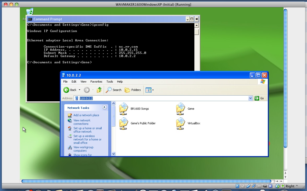 - Now boot up your Windows VM in Oracle Virtualbox and map a drive to your Mac OS X pc. Open a command prompt and type “ipconfig” to check what IP address is assigned to the Windows VM. This probably will match what is in my screenshot. The “Default Gateway” in the output of this command should be your Mac’s internal IP address. In this example during my installation the IP address was 10.0.2.2. Open Windows explorer and click “View->Toolbars->Address Bar” if it’s not visible. Type “\\10.0.2.2” and you should get a login prompt from your Mac. Enter your name and password and it should show you the shared folders.